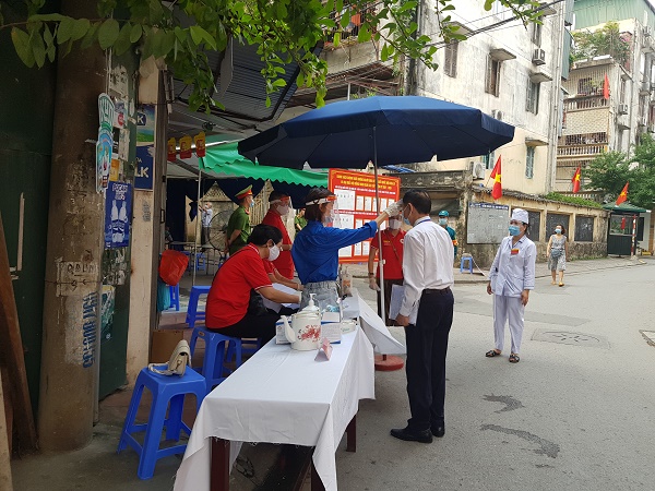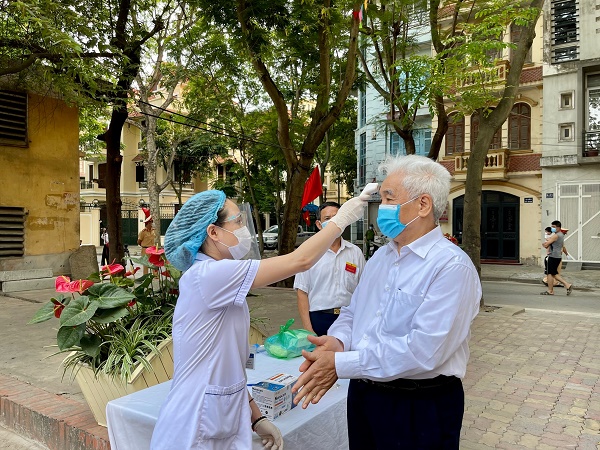 Cử tri được kiểm tra thân nhiệt trước khi vào điểm bầu cử tại phường Định Công, quận Hoàng Mai. Ảnh: Gia Huy