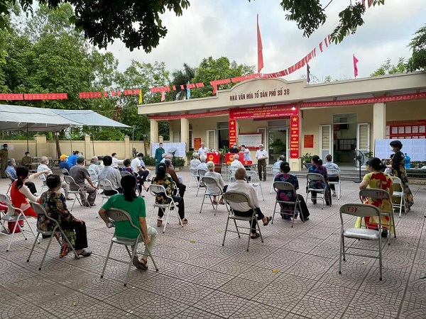 | Người dân ngồi giãn cách chờ đến lượt bầu cử tại phường Ngọc Thụy, quận Long Biên. Ảnh: Nguyên Phương |