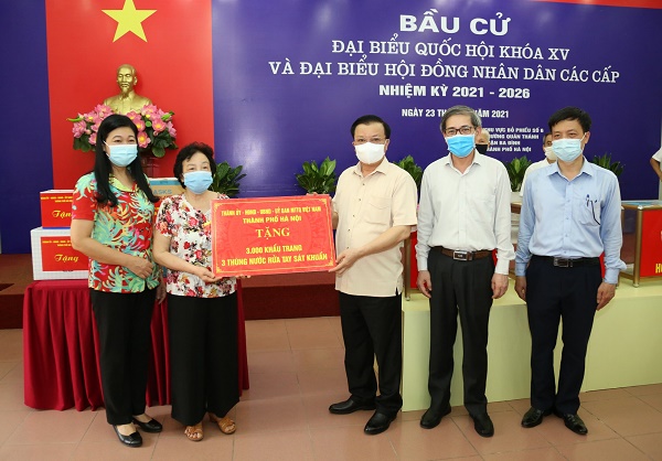Nhằm động viên, hỗ trợ các địa phương, đơn vị phòng, chống dịch Covid-19 và tổ chức bầu cử, Bí thư Thành ủy đã trao tặng hỗ trợ của thành phố tổng cộng 12.000 khẩu trang, 12 thùng dung dịch khử khuẩn và một số mũ chắn giọt bắn, găng tay y tế.