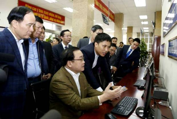 | Bí thư Thành ủy Hà Nội Hoàng Trung Hải thăm Bộ phận một cửa tại quận Nam Từ Liêm- Ảnh Gia Huy |