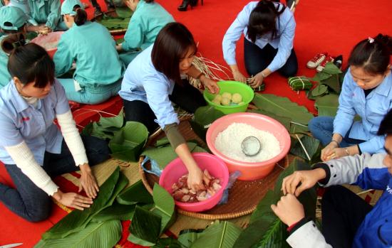 | Công nhân KCN Bắc Thăng Long tham gia gói bánh chưng trong chương trình Tết Sum vầy 2018 |