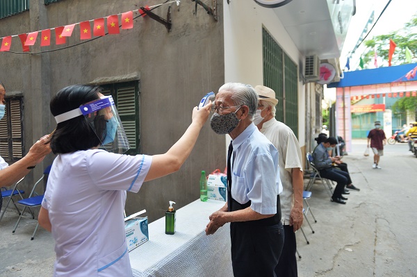 | Cụ Phạm Thế Vinh (97 tuổi) được đo thân nhiệt, rửa tay sát khuẩn trước khi vào khu vực bỏ phiếu. Ảnh: Gia Huy |