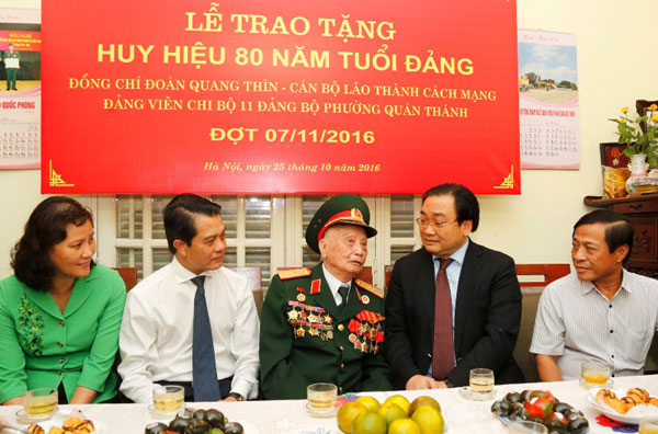 (Chinhphu.vn) - Chiều 25/10, Ủy viên Bộ Chính trị, Bí thư Thành ủy Hà Nội Hoàng Trung Hải đã trao tặng Huy hiệu 80 năm tuổi đảng cho đồng chí Đoàn Quang Thìn, cán bộ lão thành Cách mạng hiện đang sinh hoạt tại Chi bộ 11, Đảng bộ phường Quán Thánh, quận Ba Đình.